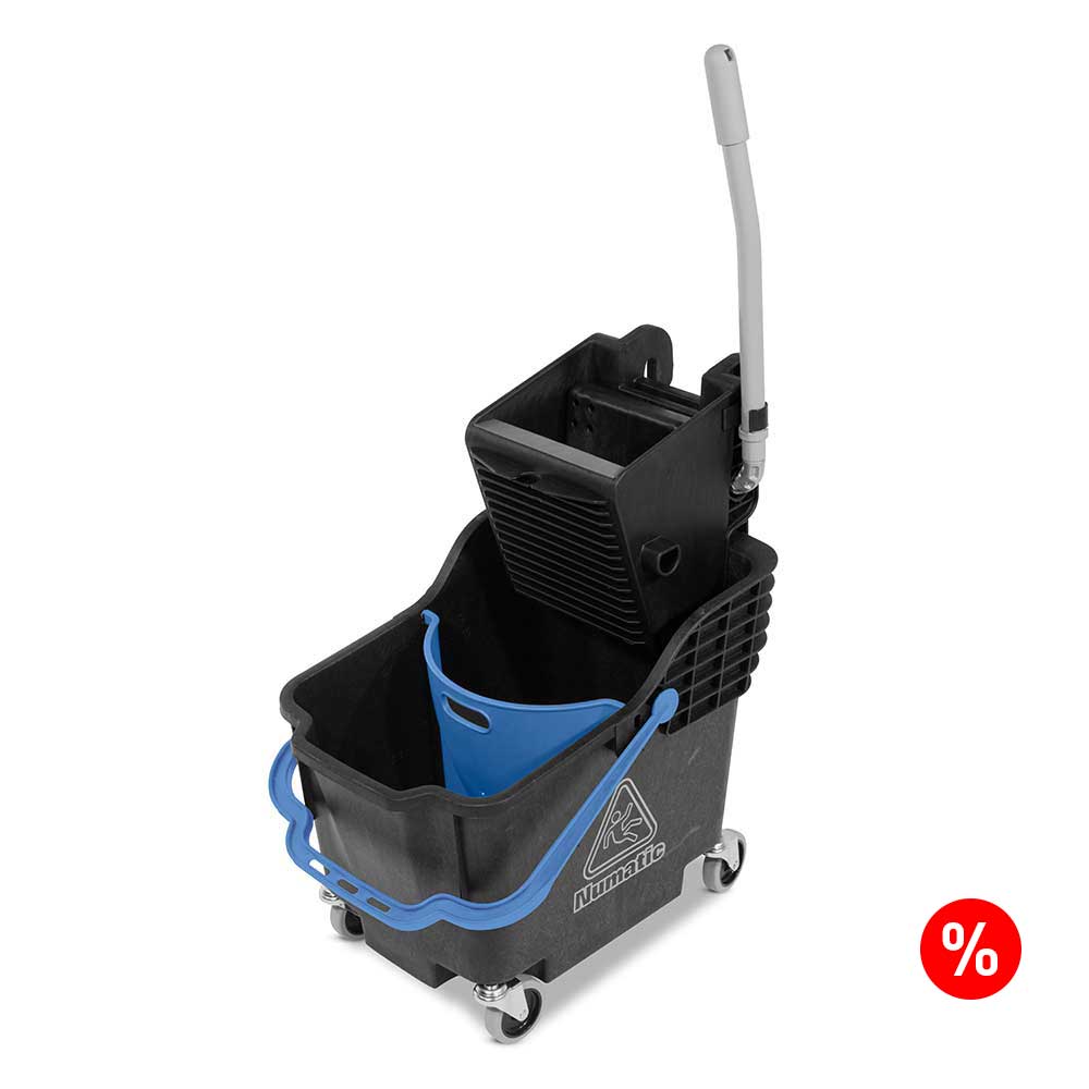 Centralną część wózka zajmuje wiadro o pojemności 30 litrów. Dzięki zdejmowanej przegrodzie dostępną przestrzeń można podzielić na 2 niezależne komory o litrażu 18l + 12l. System wyposażony jest w wytrzymałą dociskarkę (dolny odpływ wody), która znakomicie współpracuje z mopami typu Kentucky oraz płaskimi. Po założeniu przegrody brudna woda gromadzi się w oddzielnym pojemniku, co pozwala na efektywne wyczyszczenie posadzki bez niepożądanych brudnych smug czy nacieków. Wszystkie akcesoria są łatwe w montażu i demontażu, co znacznie ułatwia pracę.