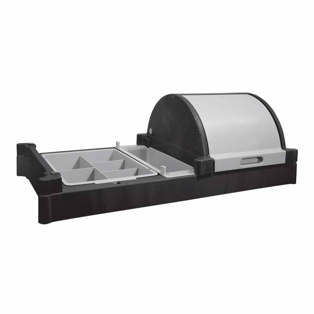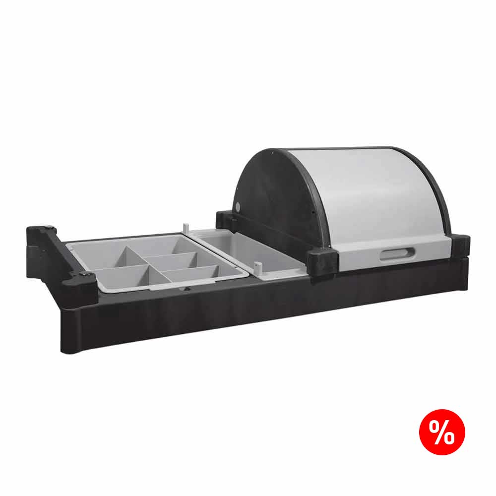 W skład zestawu wchodzą trzy kuwety, w tym jedna wyposażona w pokrywę, umożliwiającą bezpieczne przechowywanie wybranych akcesoriów lub środków czystości. Każda z kuwet posiada praktyczne przegrody, które pozwalają na uporządkowane rozmieszczenie niezbędnych elementów wykorzystywanych podczas obsługi pokoi hotelowych.